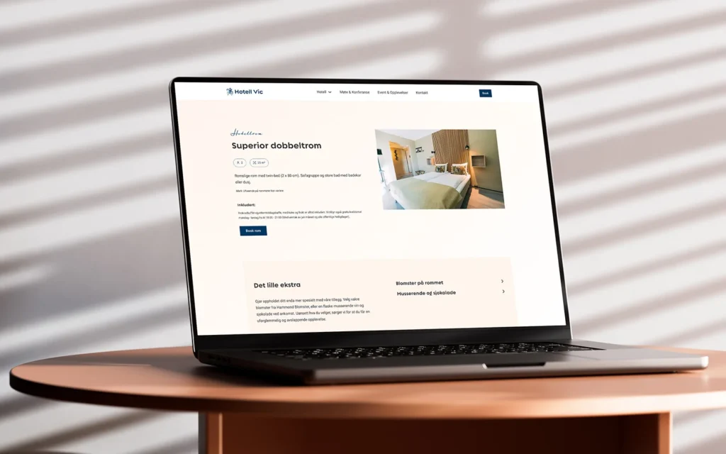 For Hotell Vic i Porsgrunn har vi utviklet en ny nettside i WordPress med Bricks, skreddersydd for å